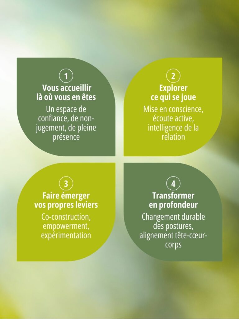 Plus qu’une méthode ou une simple relation contractuelle, je vous propose un partenariat de transformation, garanti par la manière dont j’incarne et exerce mon métier de coach et formatrice :